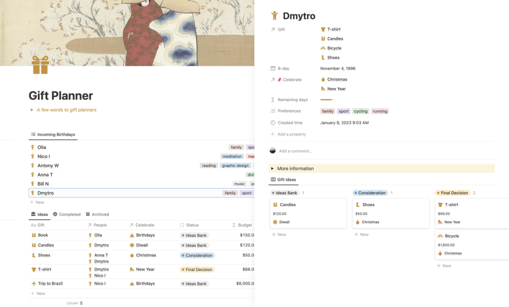 Looking for an easier way to manage your gift-giving? Look no further than Gift Planner, the Notion template that helps you organize and track your gifts for any occasion.